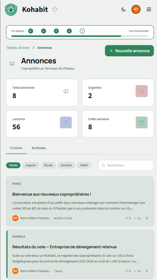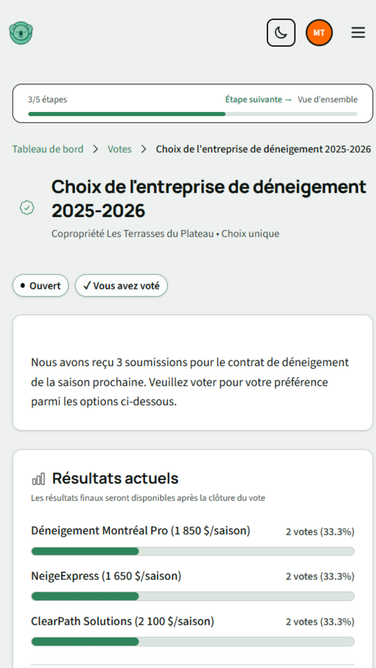 Annonces, votes, finances, carnet d'entretien, tout est centralisé. Moins de courriels, plus de clarté.