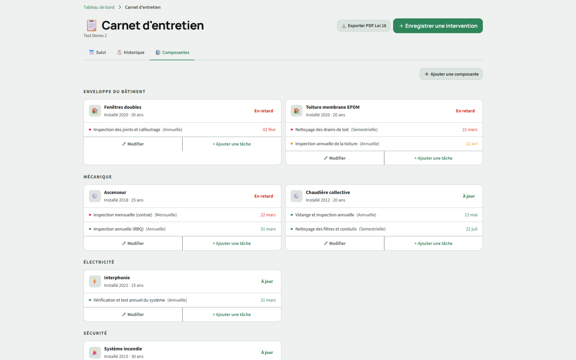 Consignez vos actifs, planifiez les inspections et générez votre carnet d'entretien conforme à la Loi 16. Répondez à vos obligations légales sans effort.