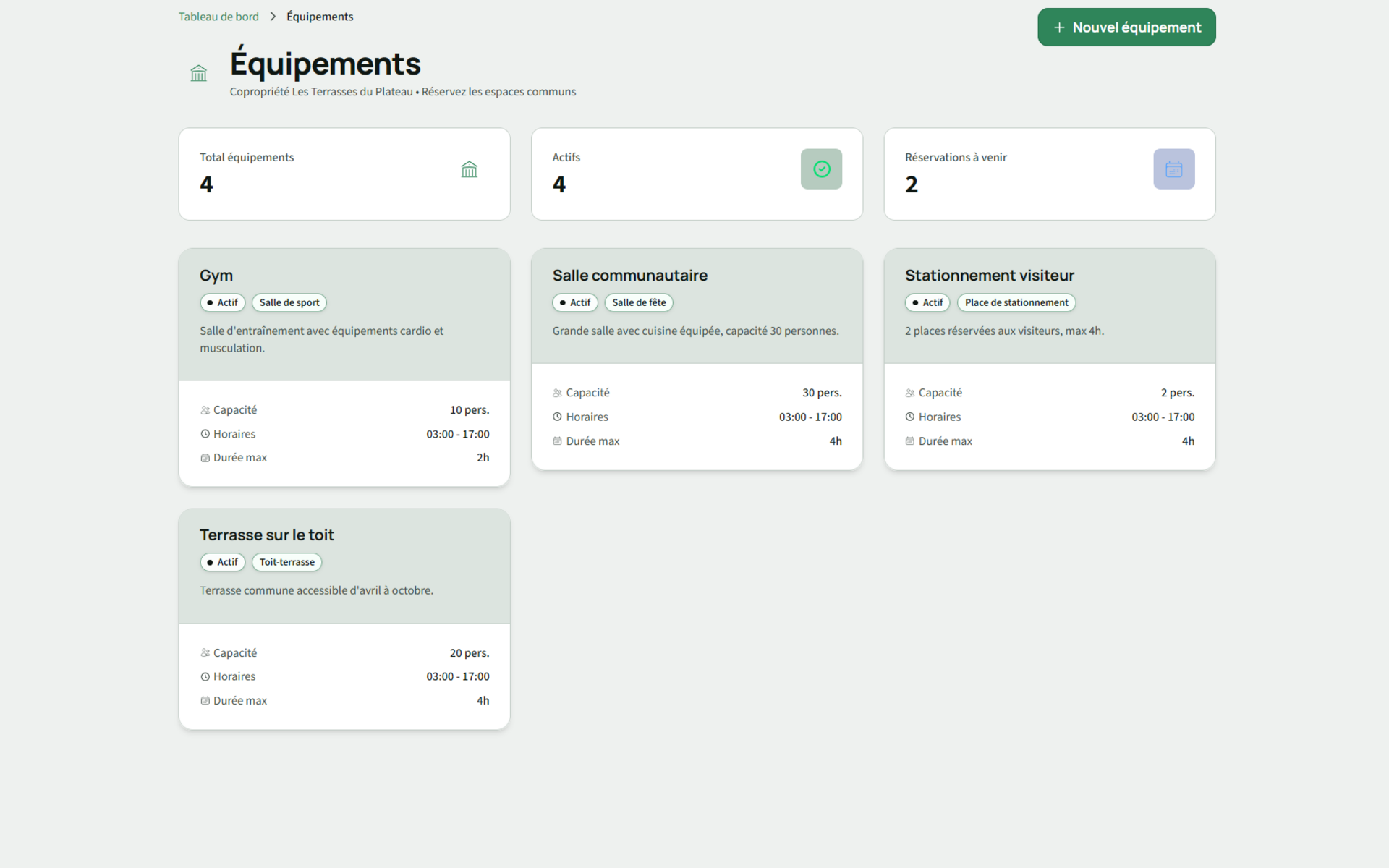 Salle communautaire, gym, stationnement visiteur, les résidents réservent eux-mêmes. Un calendrier partagé pour éviter les conflits.
