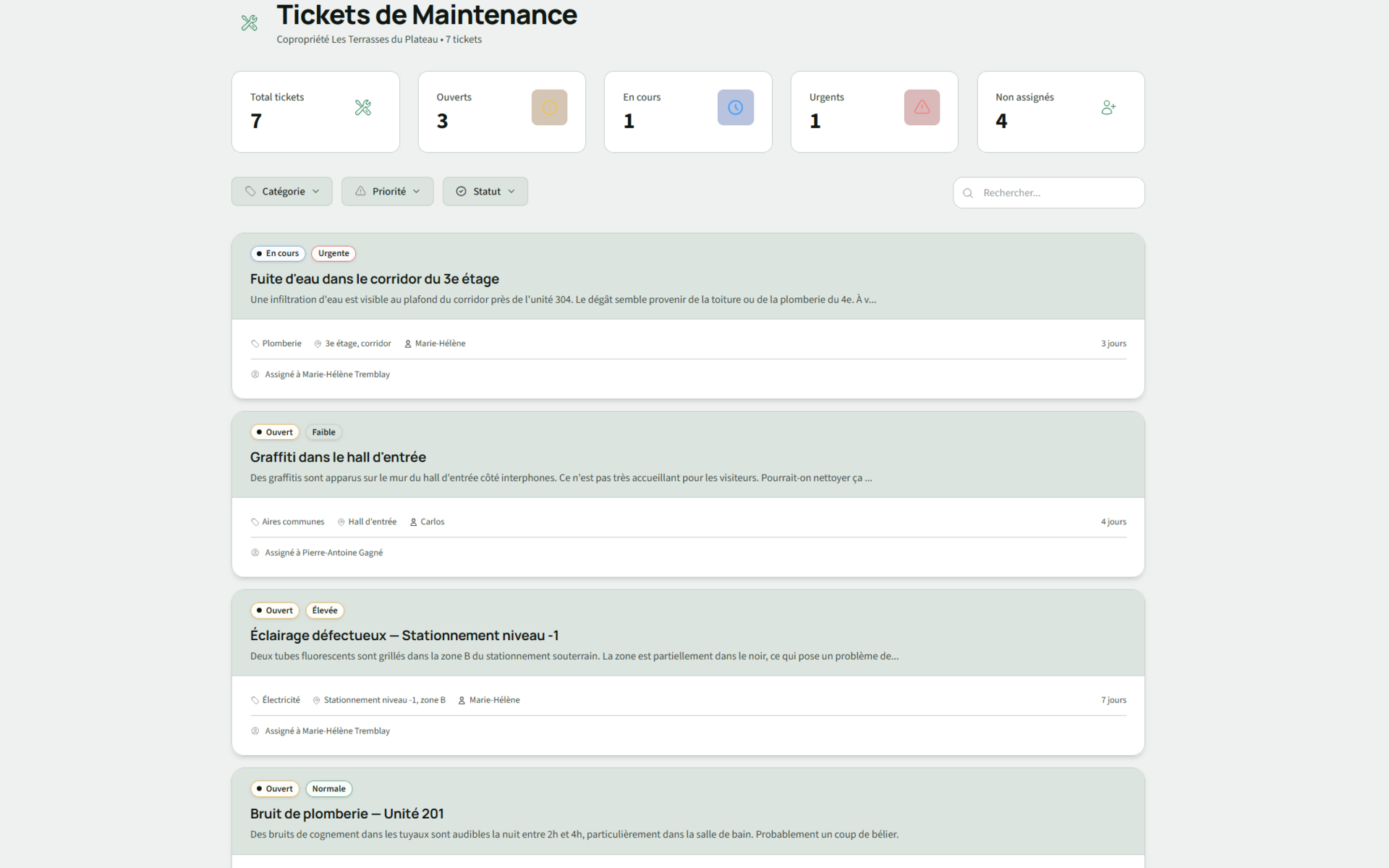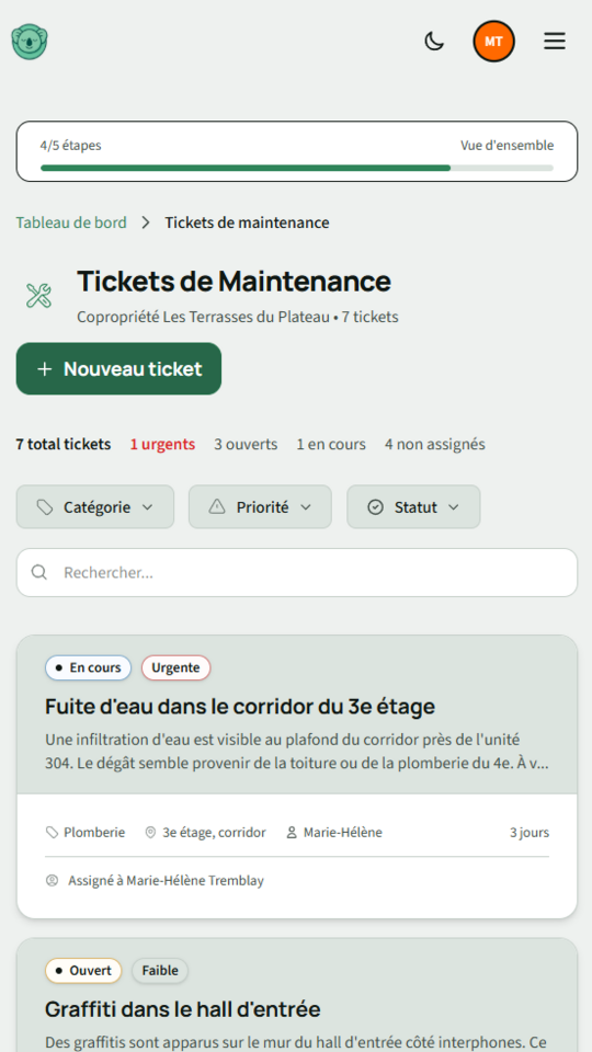 Les résidents signalent un problème, le syndic le traite. Suivez l'avancement de chaque demande en un seul endroit, fini les courriels perdus.